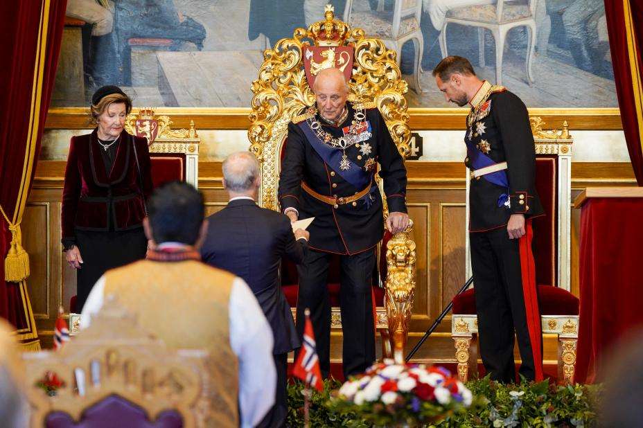 Statsminister Jonas Gahr Støre (Ap) overrekker trontalen til kong Harald under åpningen av det 167. Storting mandag. Dronning Sonja til venstre og kronprins Haakon til høyre. Foto: Heiko Junge / NTB