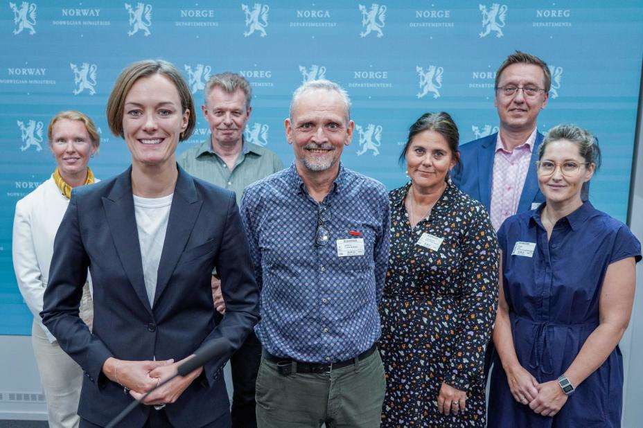 Kultur- og likestillingsminister Anette Trettebergstuen (t.v.) sammen med Claus Moxnes Jervell fra Fellesforbundet som skal lede regjeringens mannsutvalg, og deler av utvalget som var til stede under pressekonferansen på fredag. Foto: Ole Berg-Rusten / NTB