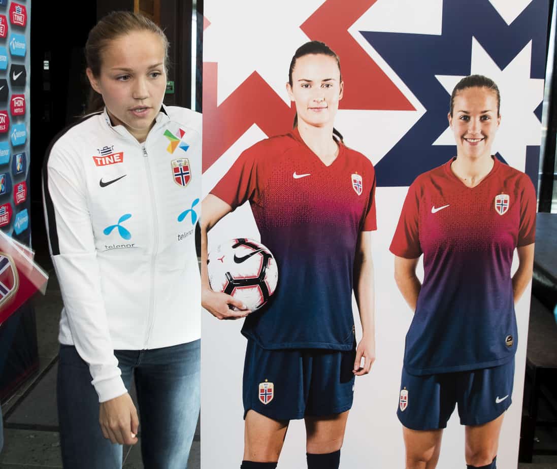 Guro Reiten var til stede både på plakat og i levende live da Norges VM-tropp i fotball ble presentert torsdag, og hun fikk en utfordring fra landslagssjef Martin Sjögren om å prestere enda bedre enn hun har gjort på landslaget. Foto: Terje Pedersen / NTB scanpix