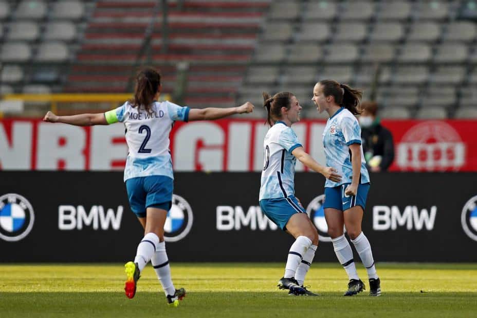 Guro Reiten (t.h) scoret et flott mål på frispark i torsdagens seier mot Belgia. Foto: Francisco Seco / AP / NTB