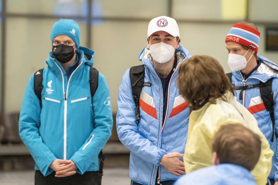 Kristjan Ilves (t.v.) sammen med Jarl Magnus Riiber og Espen Andersen før avreise fra Gardermoen til Beijing mandag. To dager senere ble det kjent at Ilves har fått korona. Foto: Terje Pedersen / NTB