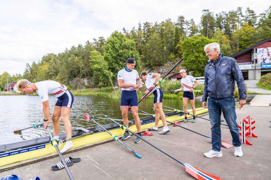 Jonas Juel, Erling Øyasæter, Martin Helseth og Erik Solbakken ror i den norske dobbeltfireren. Øyasæter kom tilbake i semifinalen etter å ha vært ute med sykdom.
