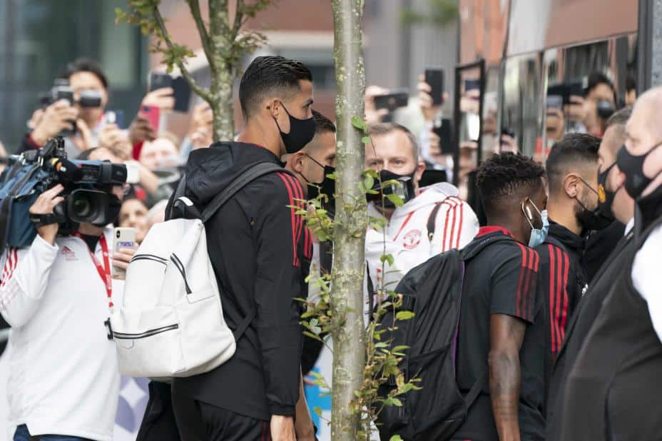 Manchester Uniteds Cristiano Ronaldo ankommer laghotellet før kampen mot Newcastle. Foto: Jon Super / AP / NTB