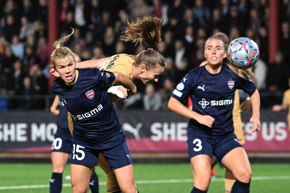 Rosengård-spillerne Jessica Wik og Gudrún Arnardóttir i aksjon mot Caroline Graham Hansen og Barcelona i høst. Foto: Johan Nilsson / TT / NTB
