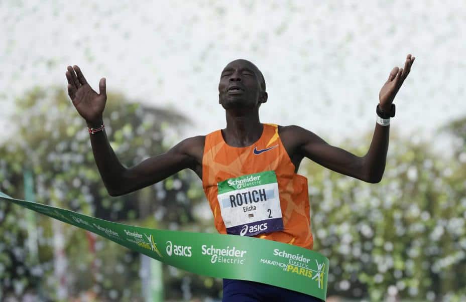 Kenyanske Elisha Rotich smadret løyperekorden i Paris maraton da han noterte 2.04.23 i sitt løp.