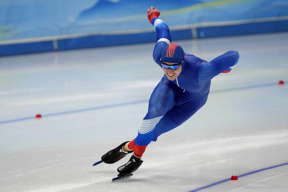 Viktor Musjtakov får ikke gå skøyte-VM f the Russian Olympic Committee competes in the men's speedskating 500-meter race at the 2022 Winter Olympics, Saturday, Feb. 12, 2022, in Beijing. (AP Photo/Ashley Landis)
