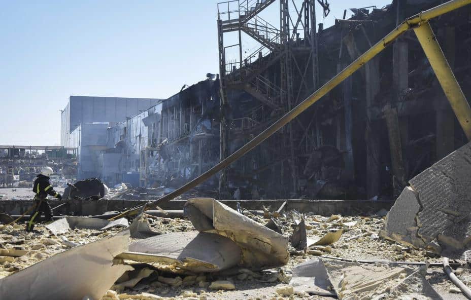 En ukrainsk brannmann ved et ødelagt bygg i utkanten av Odesa 10. mai. Ifølge den ukrainske hæren avfyrte Russland sju missiler fra luften mot havna i Odesa. Et kjøpesenter og et lager ble truffet. Foto: AP / Max Psjybysjevskyj / NTB