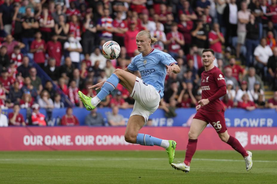 Manchester Citys Erling Braut Haaland endte uten scoring og med 1-3-nederlag for Liverpool i Community Shield-kampen. Mo Salah avgjorde med et straffespark.