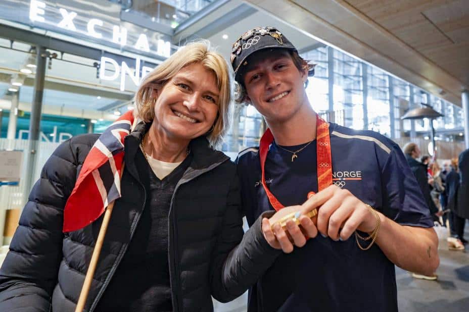 Friskikjøreren Birk Ruud (21) ble møtt av sin mor Celin da han landet på Gardermoen torsdag etter OL i Beijing. Gullmedaljen var synlig hengende rundt halsen.