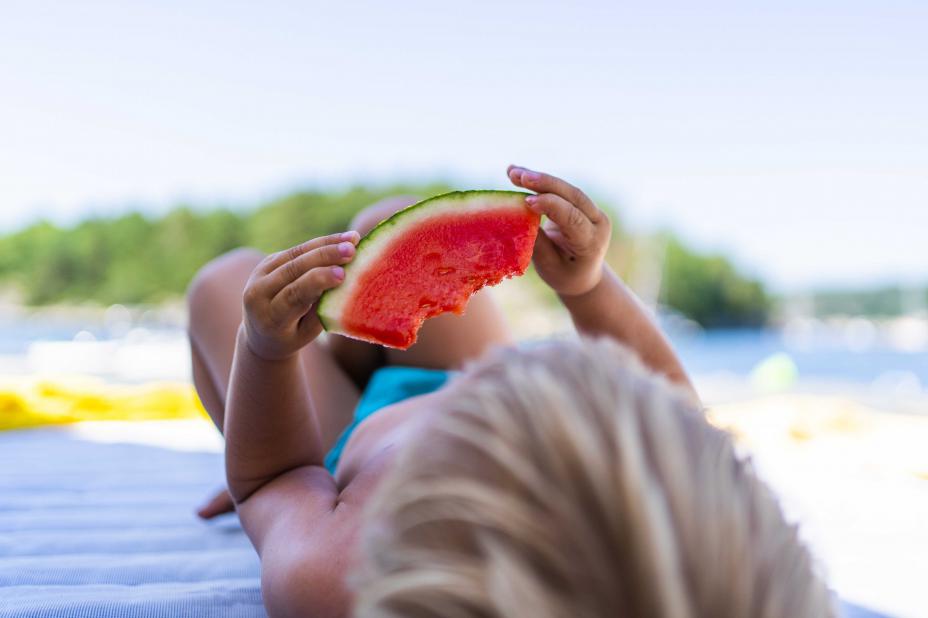 En liten gutt koser seg med vannmelon sommeren 2021.Foto: Håkon Mosvold Larsen / NTB