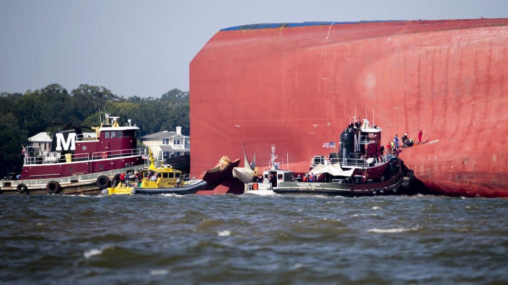 Det 200 meter lange skipet er lastet med biler. Det fikk slagside etter å ha forlatt havnen i Brunswick og var på vei til Baltimore. Årsaken til ulykken er ikke klar.