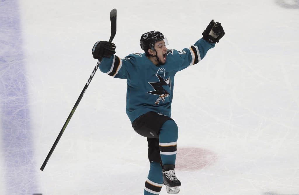 San Jose Sharks' Kevin Labanc jubler etter mål mot Vegas Golden Knights. Foto: Jeff Chiu / AP / NTB scanpix.