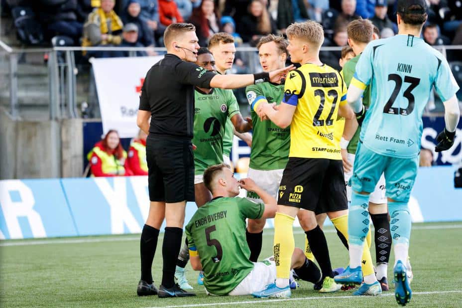 Dommer Harald Sletner nøyde seg med gult kort til Wangberg, til store protester fra gjestene.
