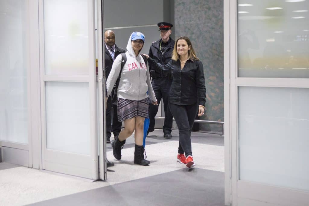 – Dette er en svært modig ny canadier som har gått gjennom mye og som nå har fått dra til sitt nye hjem, sa Freeland ved al-Qununs side.
