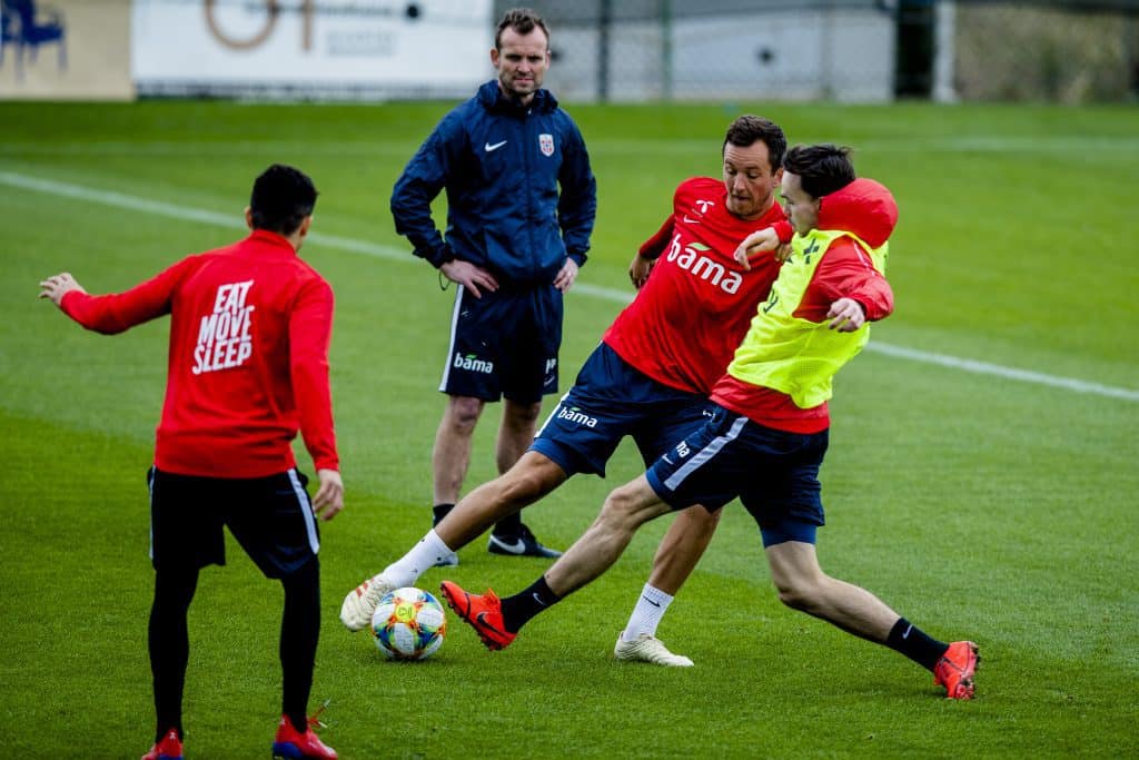 Oliva, Spania 20190320. Even Hovland og Ole Kristian Selnæs under treningen til landslaget i fotball før EM-kvalifiseringskampen mot Spania på lørdag. Foto: Stian Lysberg Solum / NTB scanpix