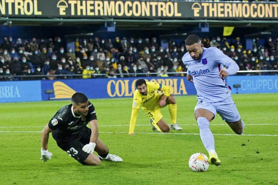 Memphis Depay runder keeper og scorer Barcelonas ledermål i det 88. minutt av borteseieren mot Villarreal. Foto: Alberto Saiz, AP / NTB