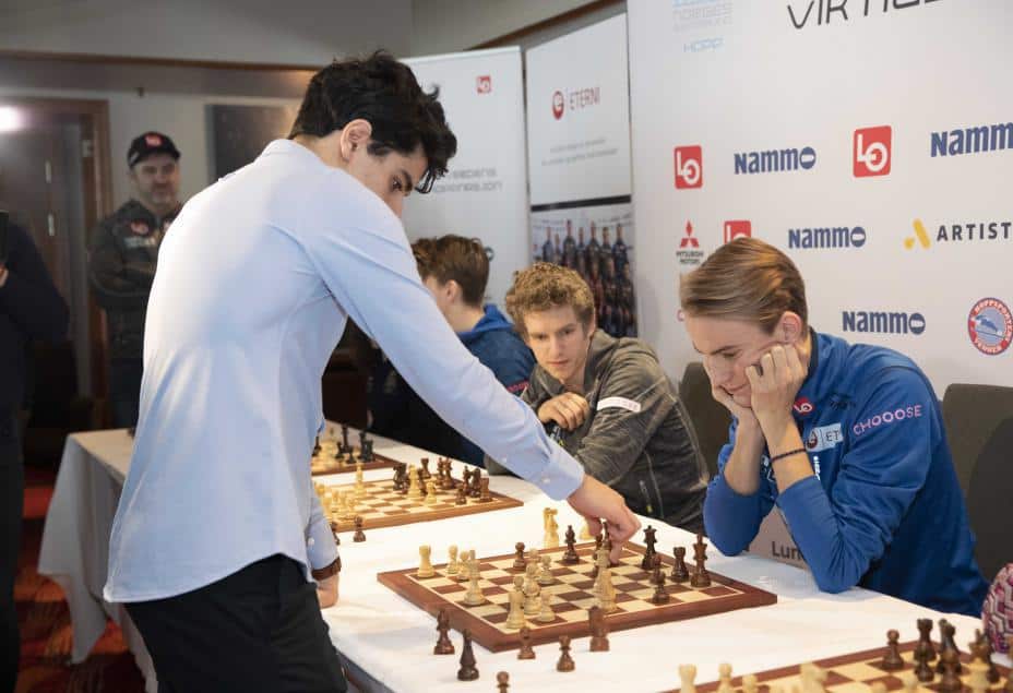 Skihopper Daniel-André Tande (t.v.) spiller sjakk mot tidligere juniorverdensmester Aryan Tari i 2020. Foto: Terje Bendiksby / NTB