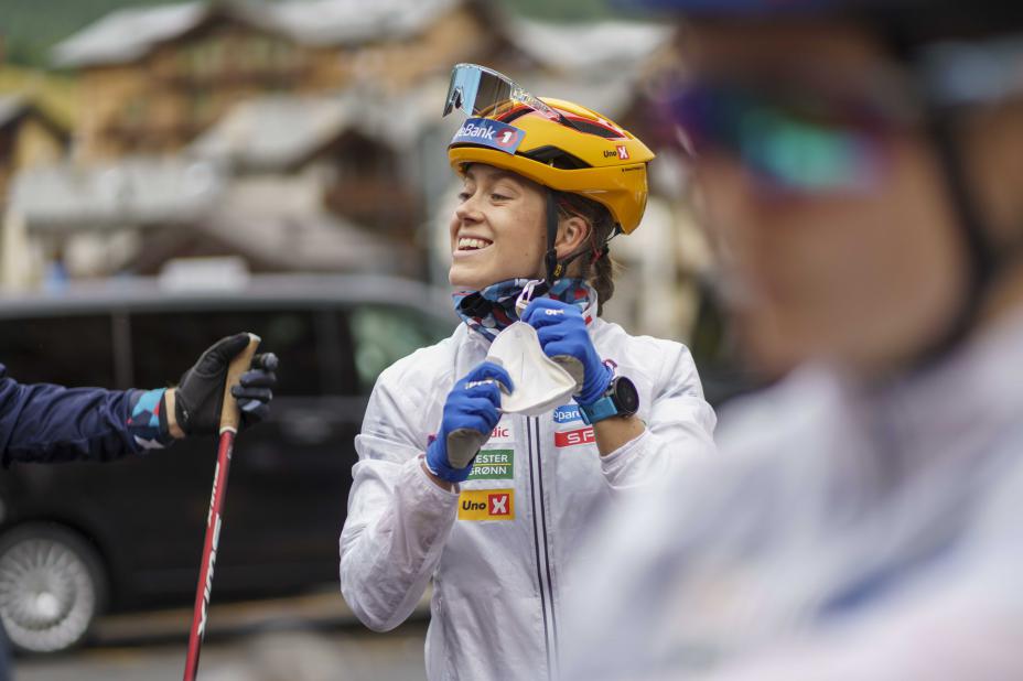 Langrennsløper Marte Skaanes gjør seg klar til å trene på rulleski under et høydeopphold i Livigno. Foto: Heiko Junge / NTB
