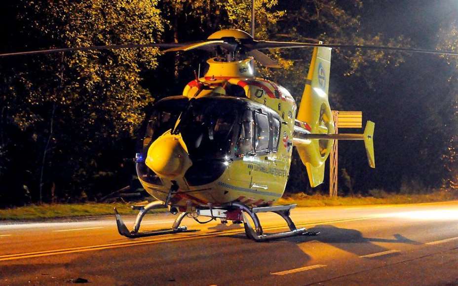 Fører, jente på 20 år, ble flydd med luftambulanse til SUS. Uvisst skadeomfang. Snøen har lagt seg på veien og der er glatt. Veien er nå åpen og politiet er ferdige på stedet.