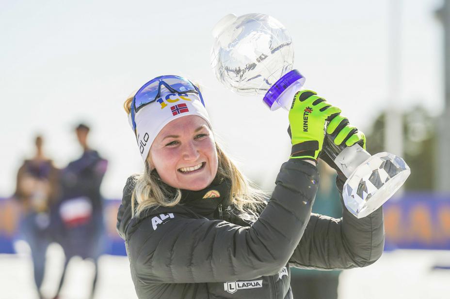 Marte Olsbu Røiseland viser fram den store glasskulen for sammenlagtseieren i verdenscupen for forrige sesong. Foto: Terje Bendiksby / NTB