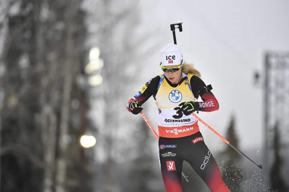 Marte Olsbu Røiseland hadde annenplassen ut fra liggende bak ledende Hanna Sola. Hun gikk ut 12,1 sekunder bak Hanna Öberg ut fra stående skyting på en fjerdeplass. Med en god spurt sikret hun seg en ny pallplassering. Hun hadde nest raskeste tid i langrennet og var bare ti sekunder bak svenske Elvira Öberg foran seg.