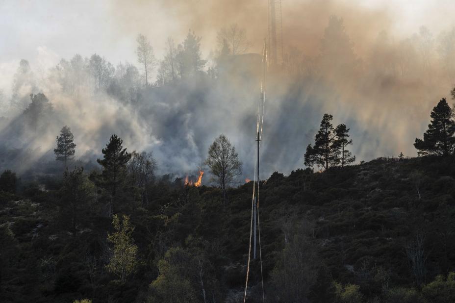 – Man kan se flammer på lang avstand. Skogbrannhelikopter er ankommet og settes straks i innsats. Sivilforsvaret har ankommet, og BKK har koblet ut høyspentledning på stedet, tvitrer 110 Vest.