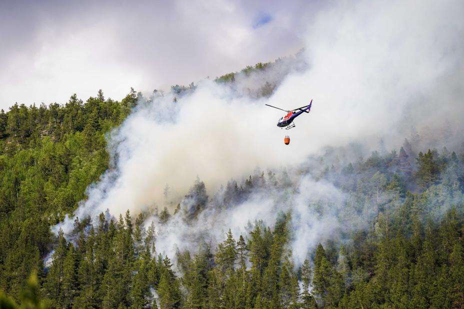Det brenner i et område mellom Dombås og Dovre sentrum, samme sted som det brant mandag og tirsdag denne uken. Brannen blusset opp igjen torsdag kveld, og skogbrannhelikopter og bakkemannskap ble satt inn i slukkingsarbeidet.