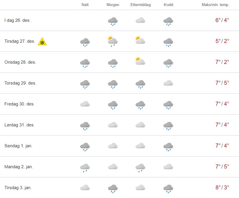 Været: Fra tirsdag morgen blir det overgang til sludd- og snøbyger. Lokalt kan det komme 5-15 cm snø.