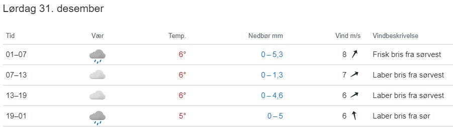 Foreløpige varsler for nyttårsaften viser at vi får regn og laber bris fra sør når rakettene skal skytes opp.