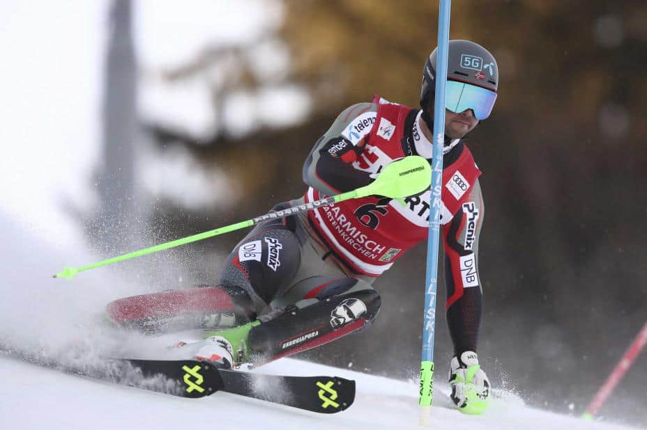Sebastian Foss Solevåg er nærmest av de norske i slalåmrennet i Garmisch-Partenkirchen. Foto: Gabriele Facciotti / AP / NTB