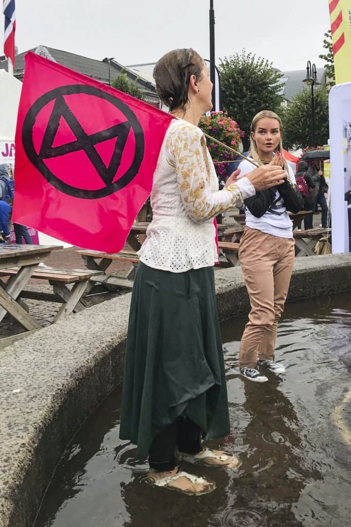 I klimakampens navn tok kjendisblogger Sophie Elise og en håndfull andre aktivister fra Extinction Rebellion Norge et bad i en fontene i Arendal.