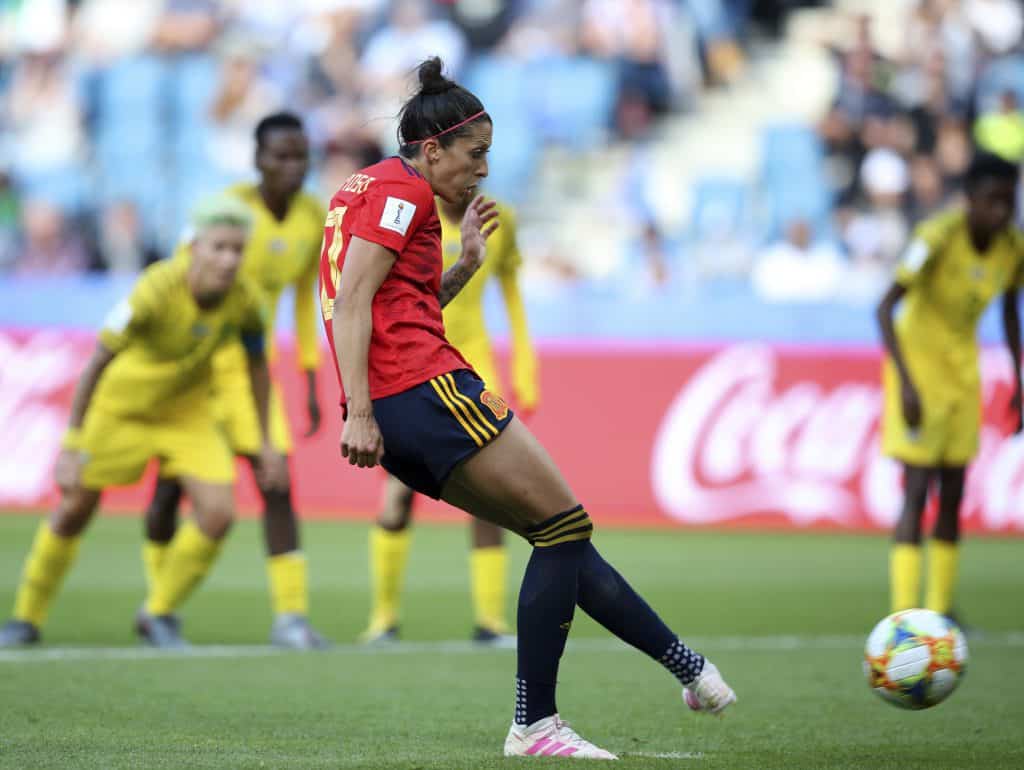 Jennifer Hermoso setter inn et av de to straffesparkene som vendte kampen mot Sør-Afrika og forhindret en kjempesensasjon i lørdagens VM-kamp. Spania vant 3-1. Foto: Francisco Seco, AP / NTB scanpix