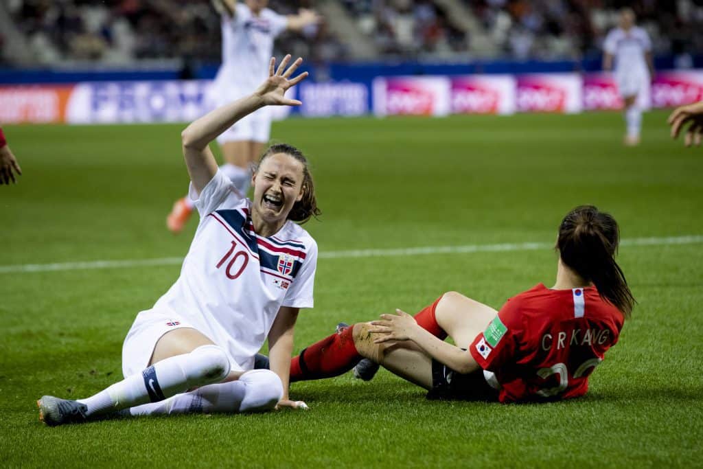Caroline Graham Hansen skriker i smerte etter å ha blitt taklet på ankelen og fått straffesparket som ga Norge 2-1-seier over Sør-Korea i VM mandag. Skaden kan koste Norge dyrt. Foto: Stian Lysberg Solum / NTB scanpix