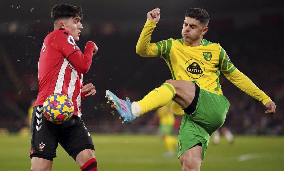 Norwich Milot Rashica i duell mot Southamptons Tino Livramento i Premier League fredag. Foto: Adam Davy/PA via AP / NTB