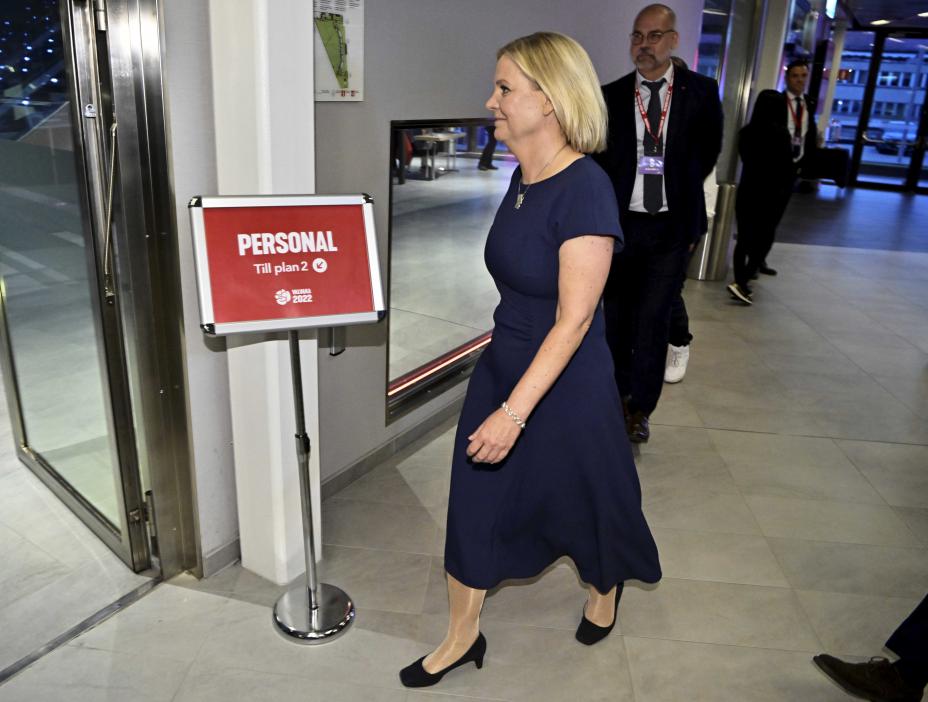 Statsminister Magdalena Andersson på vei inn til Socialdemokraternas valgvake. Hun kan komme til å kare i land en tredje periode ved makten for sitt parti Socialdemokraterna. Valgdagsmålinger tyder på et jevnt løp mellom de rødgrønne og den blå blokken. Foto: Claudio Bresciani / TT / NTB