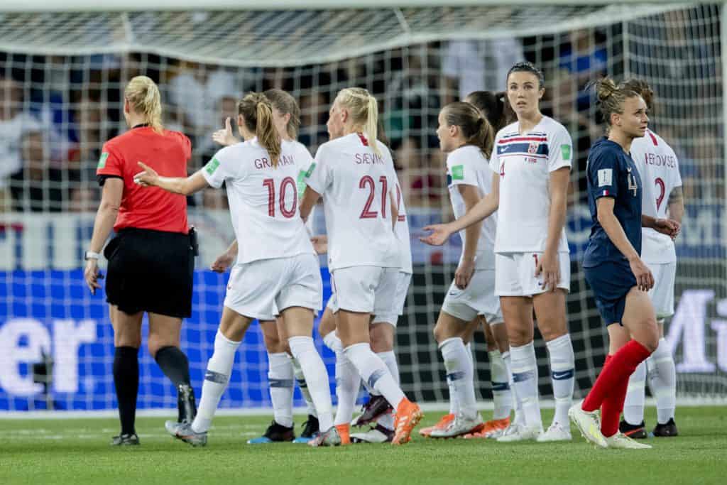 Maren Mjelde gikk i diskusjon med Bibiana Steinhaus før straffesparket ble tatt.