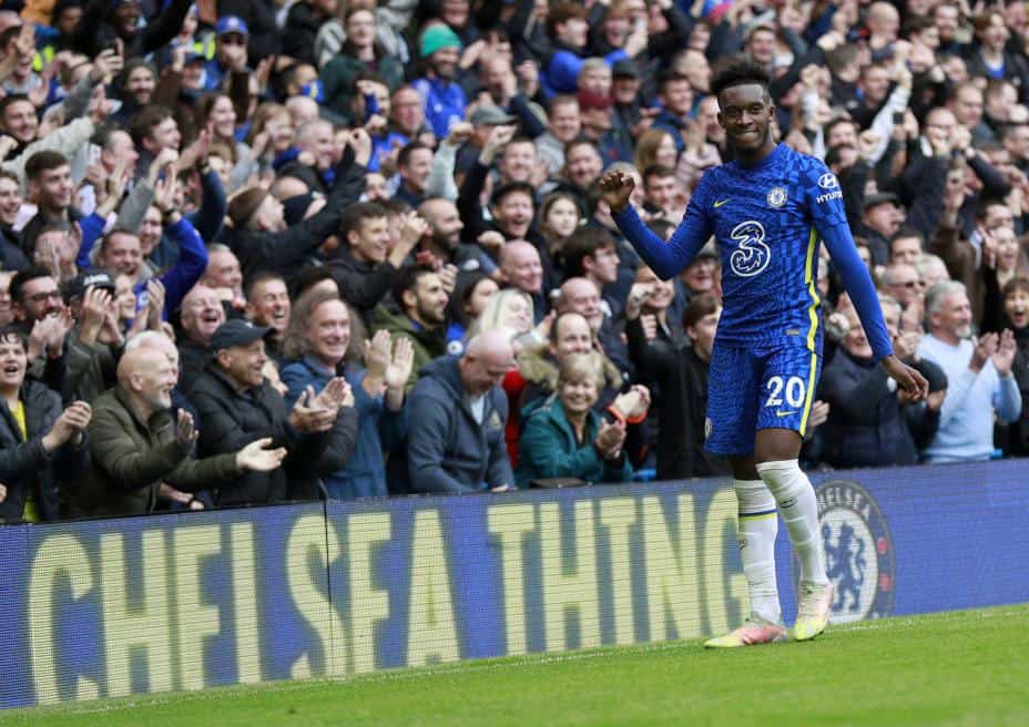 Callum Hudson-Odoi jubler foran Chelsea-fansen i en ligakamp mot Norwich nylig. Foto: Ian Walton / AP / NTB