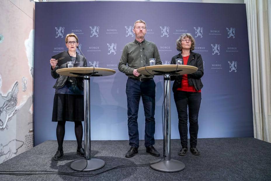 Statens forhandlingsleder Viil Søyland (t.v.) kommer med et tilbud på 10,15 milliarder kroner til Norges Bondelag ved Bjørn Gimming og Norsk Bonde- og Småbrukarlag ved Kjersti Hoff. Foto: Stian Lysberg Solum / NTB