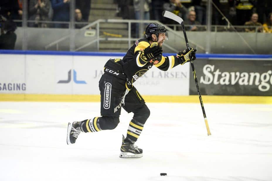 Stavanger Oilers Rob Bordson jubler etter 1-0 scoringen under den 7. semifinalen i NM i ishockey mot Sparta Foto: Carina Johansen / NTB