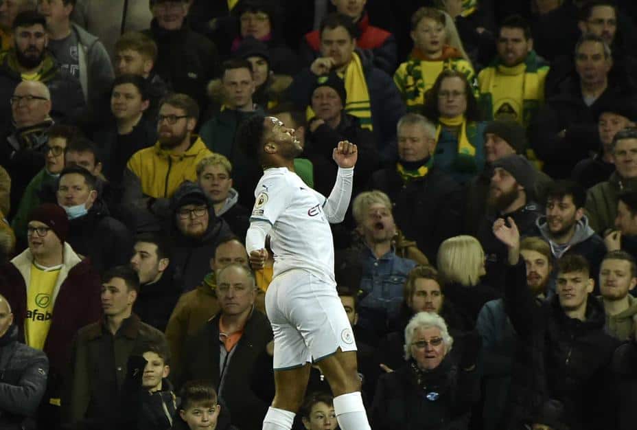 Briten scoret det første målet i kampen da han curlet ballen vakkert i mål etter en halvtime og puttet to til etter pause. Det siste kom på straffespark på overtid. Norwich-keeper Angus Gunn reddet straffen, men Sterling satte returen i mål.
