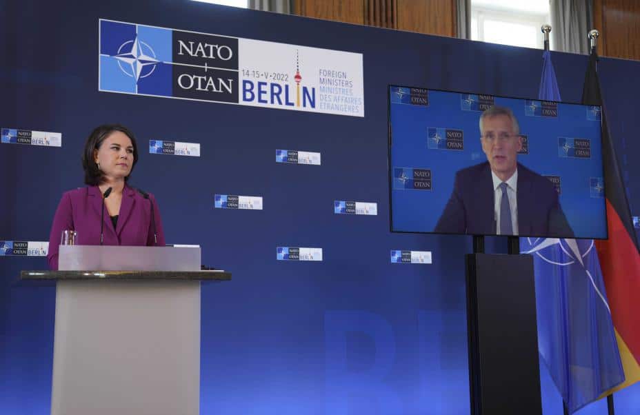 Tysklands utenriksminister Annalena Baerbock og Natos generalsekretær Jens Stoltenberg ønsker en rask prosess med avklaring av finsk og svensk medlemskap. Foto: AP Photo/Michael Sohn/NTB