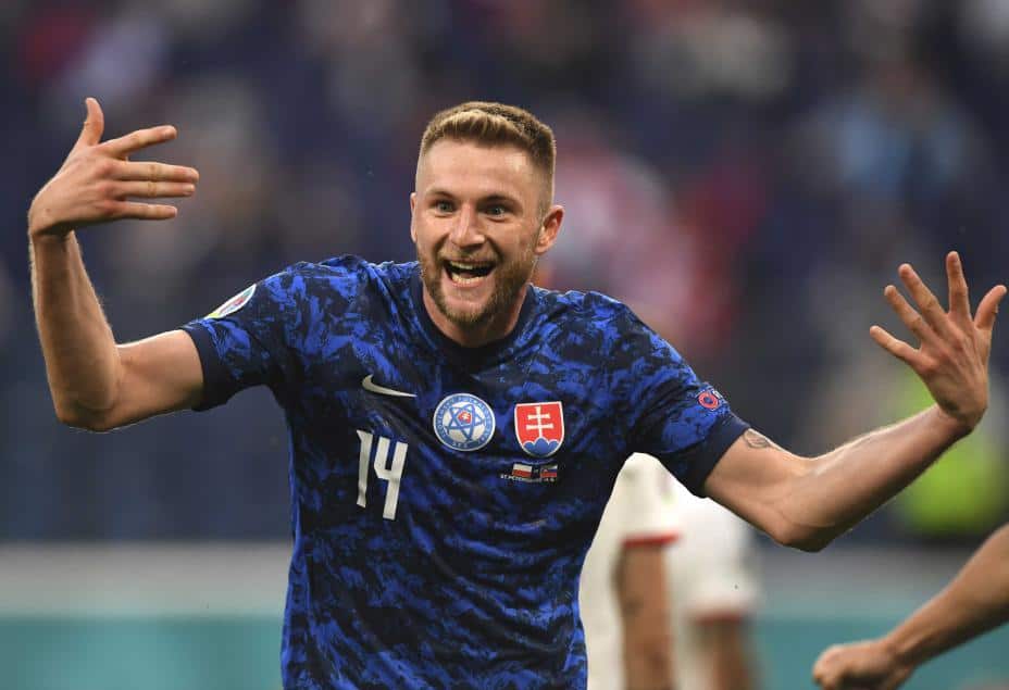 Midtstopper-bautaen Milan Skriniar sørget for at Slovakia slo Polen 2-1 i fotball-EM mandag. En polsk utvisning påvirket avslutningen på kampen.