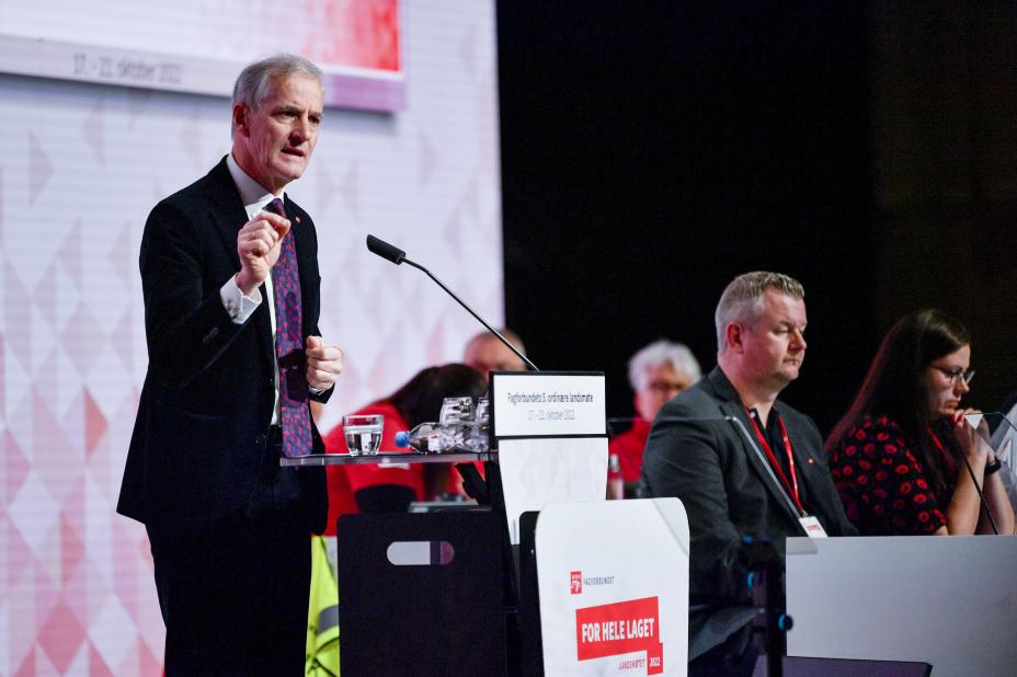 Krig og konflikter: – Russere har ikke lov å fly droner i Norge, fortsatte Støre i sin tale til landsmøtet i Fagforbundet, ifølge NRK.