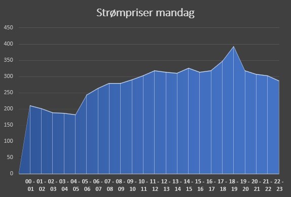 Snittprisen på strøm var 262 øre per kWh lørdag og 264 øre per kWh søndag. Mandag øker prisen litt til 282 øre og det blir større prisvariasjoner gjennom døgnet.