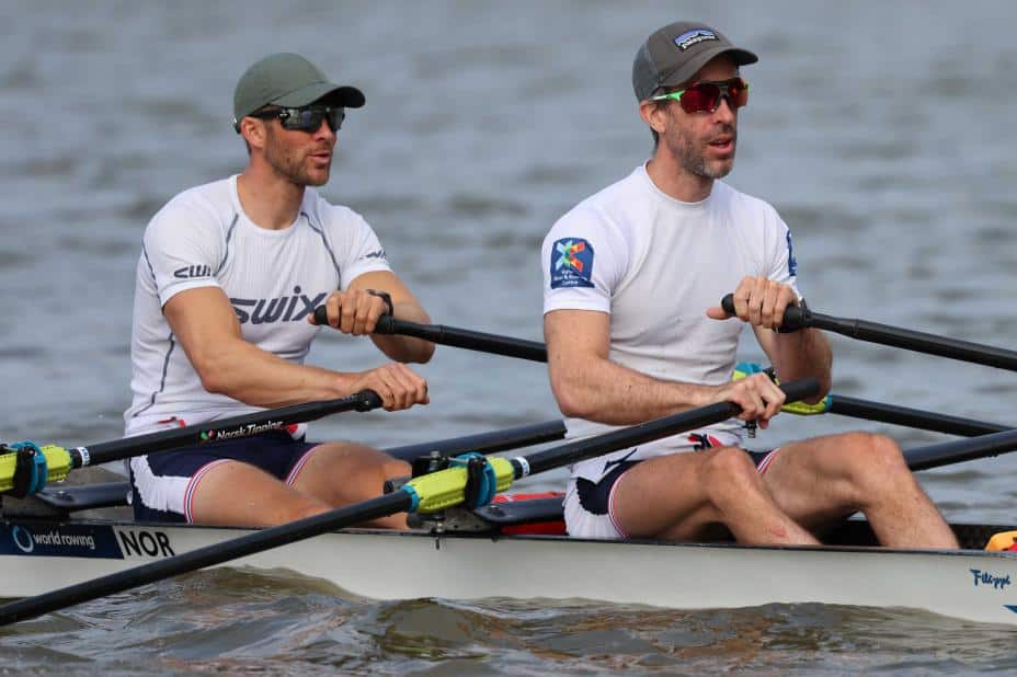 Roduoen Kristoffer Brun og Are Strandli vant A-finalen i lettvekt dobbeltsculler i Italia søndag. Det var Strandlis siste verdenscupkonkurranse.
