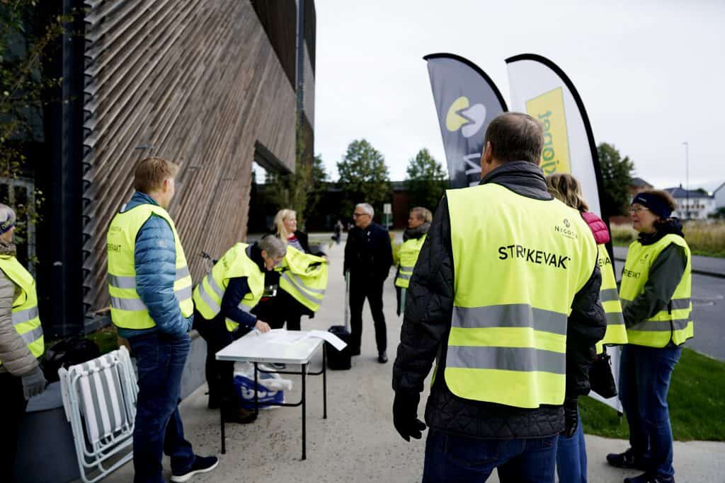 Streikende utenfor hovedkontoret til Felleskjøpet i Lillestrøm i forrige uke. Sent tirsdag kveld kom partene til enighet etter at Riksmekleren kalte partene til nye forhandlinger. Foto: Berit Roald / NTB scanpix