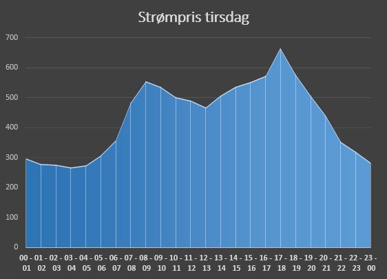 Minsteprisen for strøm natt til tirsdag er på 268 øre, mens prisen tirsdag ettermiddag kommer opp i 665 øre. Det innebærer en strømpris på rundt 9 kroner med alle kostnader.