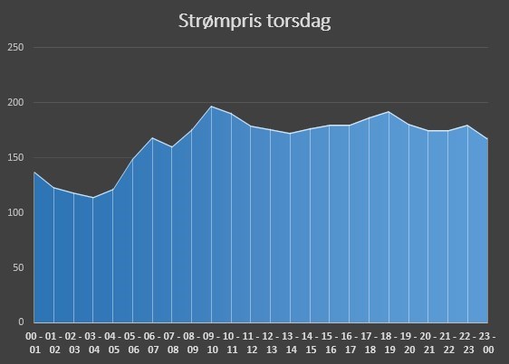 Strømprisene går litt opp igjen torsdag og vil få et snitt på 166 øre, mot 144 øre onsdag. 166 øre er imidlertid den samme prisen som vi opplevde tirsdag.