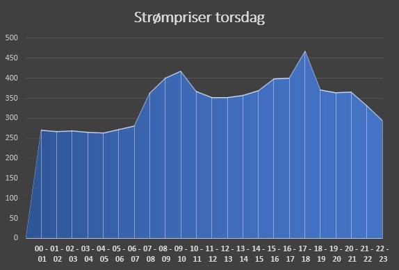 Torsdag er maksprisen på ettermiddagen er 469 øre, minsteprisen natt til torsdag er 264 øre. Snittprisen torsdag er på 341 øre per hWh.