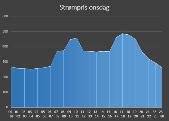 Onsdag vil snittprisen ligge på 353 øre. Maksprisen kommer onsdag ettermiddag med 488 øre, mens minsteprisen natt til onsdag blir på 253 øre.